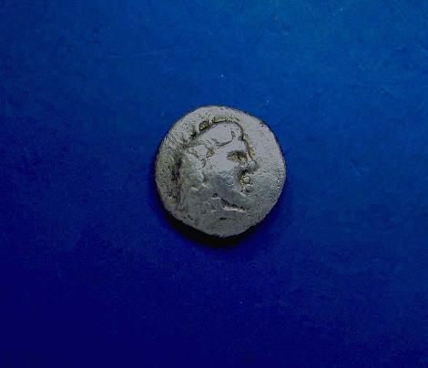 Dieser frühe Obol mit Kopfavers erinnert in seiner Darstellung fast an griechische Heraklesdarstellungen mit Löwenskalp.