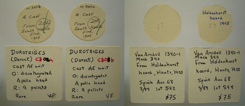 Diese beiden Viertelstatere der Osismi (Stamm von der Nordwest-Ecke Frankreichs) wurden im "trésor de Guingamp" gefunden. Dieser Münzfund enthielt 64 Statere und 190 Viertelstatere der Osismi. Der genaue Fundort dieses Schatzfundes ist nicht bekannt, man weiß aber, dass er gegen 1930 auf den Ländereien des commandant Paul Le Bonner entdeckt wurde, die alle in der nahen Umgebung von Guingamp lagen. Der Fund kam in den Besitz des Numismatikers Jean-Baptiste Colbert de Beaulieu, der zahlreiche stempelgleiche Münzen feststellte, bzw. verschiedene Koppelungen von Münzstempeln, und der den Fund 1956 publizierte:
