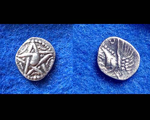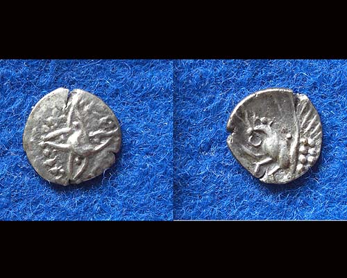 Die früheste mir bekannte Darstellung eines Pentagramms auf keltischen Münzen findet sich auf einer Tetradrachme des Typs Apollokopf/Stern (Göbl OTA 394)