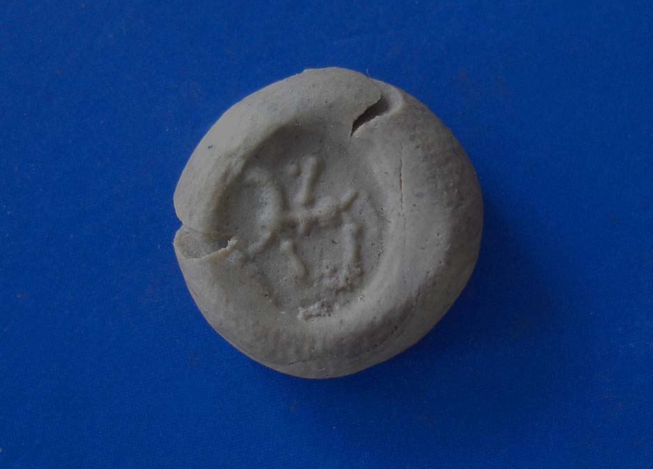 Das Bild zeigt eine späte Roseldorf II Variante, wo sich das über dem Pferd befindliche bogenförmige Beizeichen zu einer geraden Linie entwickelt hat und links davon den gewohnten Punkt. Das Beizeichen unter dem Pferd ist an den Rand gerückt und zeigt sich als kleiner Bogen mit Zentralpunkt.