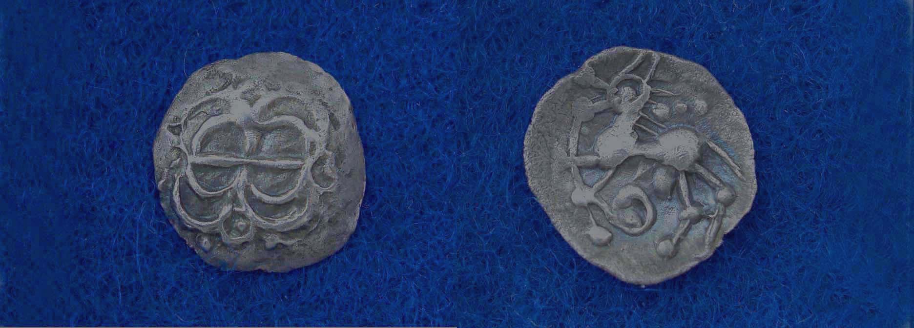 Rv: Links laufender Stier(Hirsch), darüber 3 Punkte, darunter Schlaufe. Dasselbe Beizeichen kommt auch beim Klensilber Typ Pentagramm/Pegasusprotome vor.