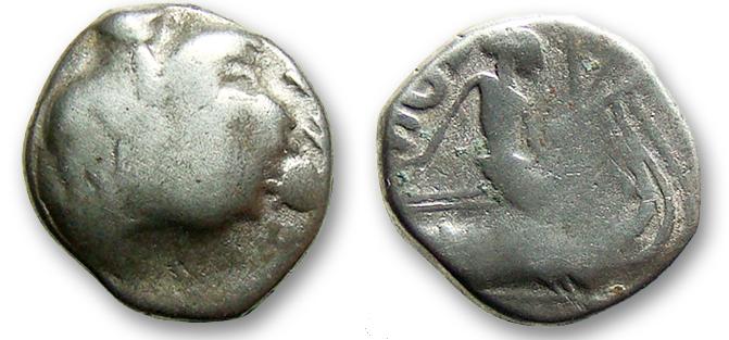 Zum einen dürfte es sich um eine keltische Imitation eines AR-Tetrobol, 14mm, 2,34gr, Euboia handeln. Vielleicht kann mir jemand dahingehend helfen, welcher Stamm diese Münzen nachgeahmt hat oder kennt ein Literaturzitat.
