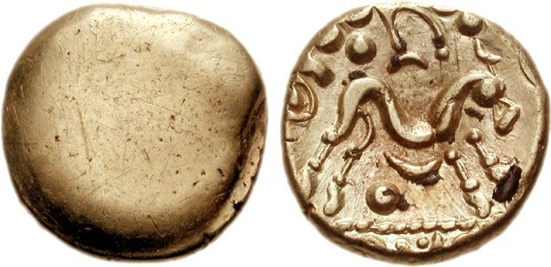 "Si le statère uniface des Ambiani est probablement la monnaie gauloise en or la plus courante, cette variété de revers (avec un globule encadré de deux petites esses entre les jambes et un annelet perlé et pointé devant le cheval) était nettement plus rare, presque exceptionnelle.