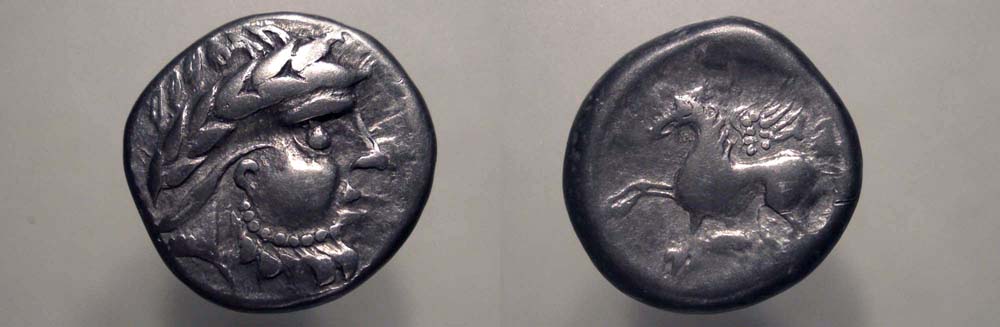Av: Zeuskopf mit betontem Wangenbereich, gebogenem Lorbeerkranz, Bartkranz und Zangenlorbeer. Rv: Pegasos mit schnabelförmiger Schnauze und Krallen nach links. Im Bereich von 6h Stempelfehler.