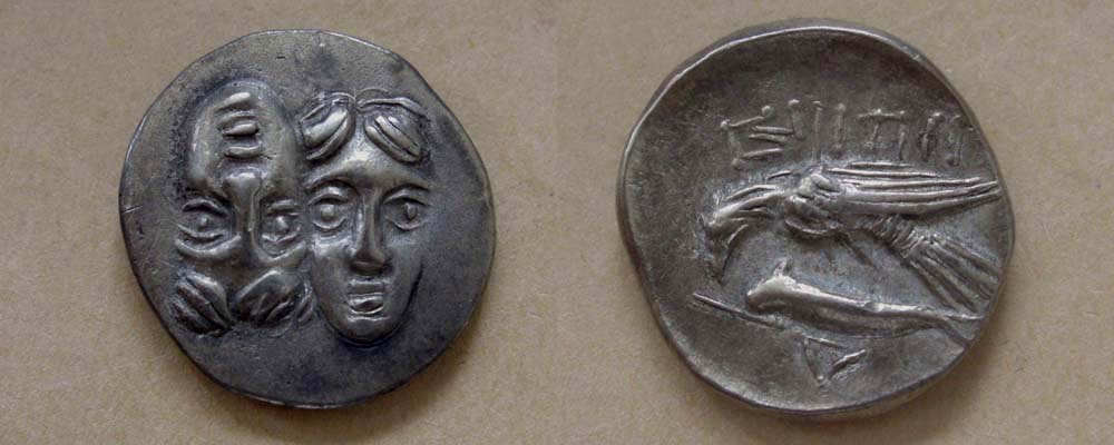 Die Rückseite zeigt einen Seeadler, der gerade einen Delfin packt, ein Münzbild das aus der Stadt Sinope stammt, deren Gründung ebenfalls von Milet ausging. Sie lag gegenüber von Istros am anderen Ufer des schwarzen Meeres und hatte mit Istros engen Handelskontakt.