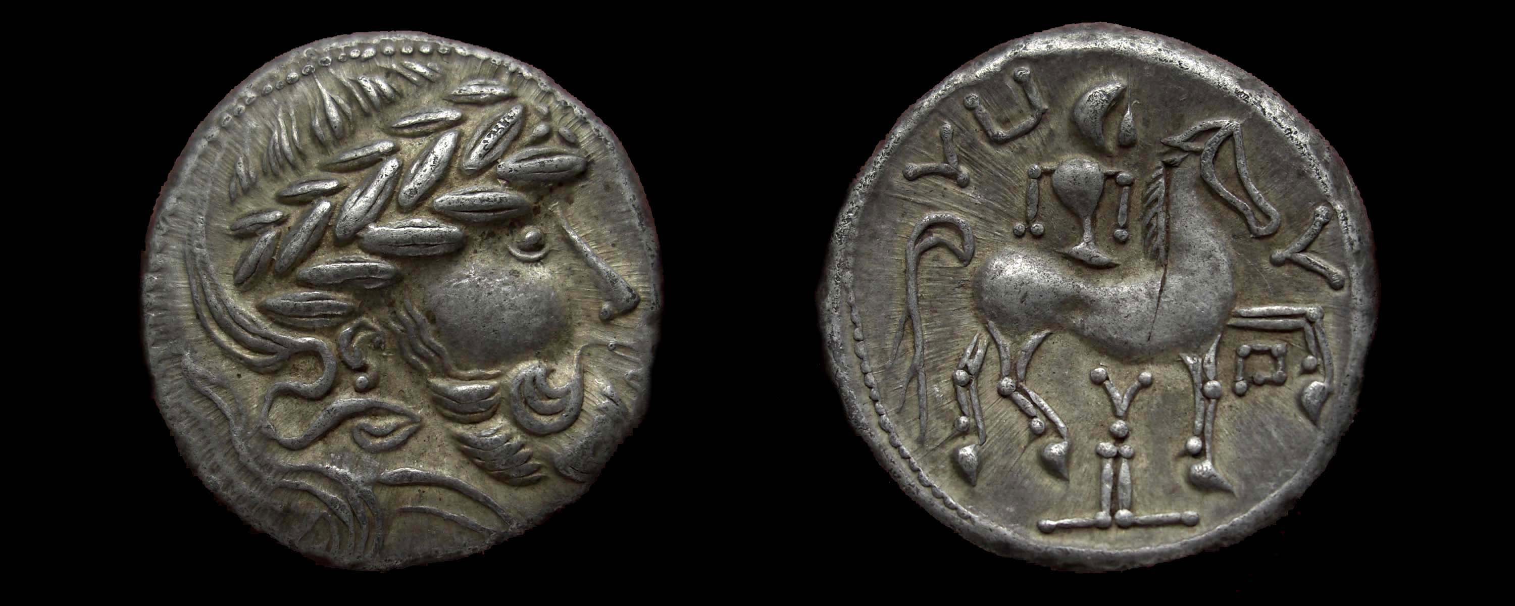 Ich finde bei diesen Prägungen besonders die Gestaltung des Averses mit dem Zeuskopf und seinem in typisch keltischer Formensprache gestaltetem arabeskenförmigen Nacken bemerkenswert.