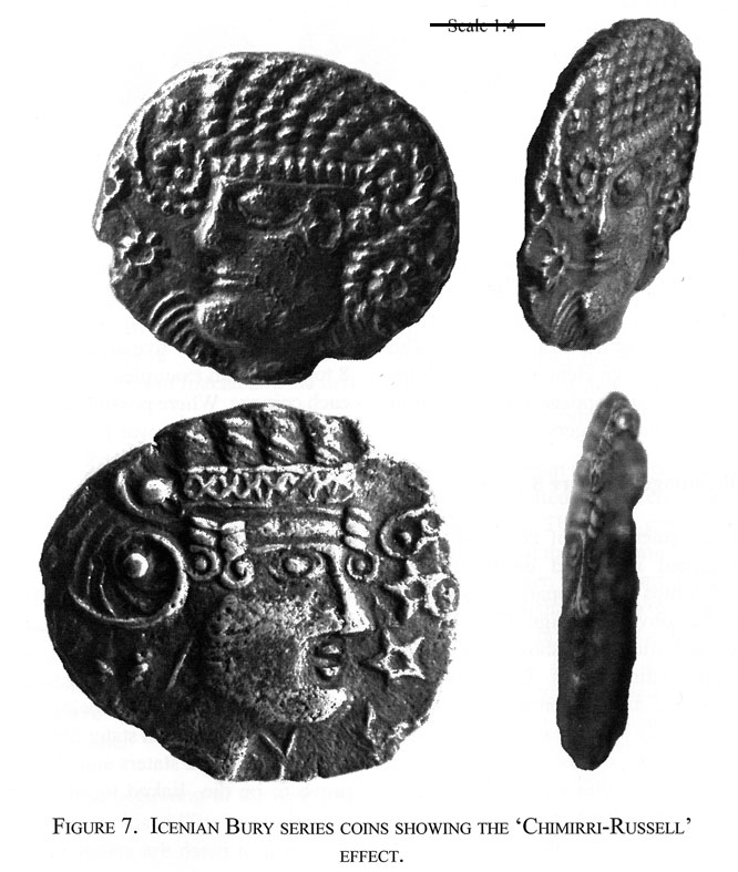 eine ganz interessante Beobachtung gibt es für einige Münzen der Iceni: betrachtet man die Münzen von der Seite, erscheinen bei Aufsicht außerhalb der Kopfdartstellung befindliche Symbole als Teil eines dann scheinbar frontal dargestellten Gesichtes: