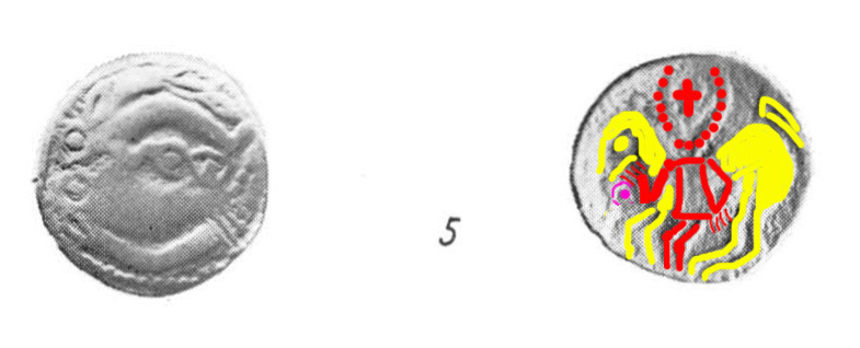 Zu deiner Frage: Insgesamt sind 6 Beine dargestellt: die beiden Vorderläufe bei 7-8 Uhr (durch Prägeschwäche schwer erkennbar), die beiden Beine des Menschen und die Hinterläufe.