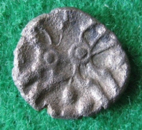 Die eine ist laut Händler ein Billonstück der britischen Dubunni (ich kenne sie unter dem Namen Dobunii - falls es die gleichen sind). Ein stilisierter Kopf - von dem ich nicht weiß ob ich ihn richtiggedreht zeige, und ein stilisiertes Pferd. Das Stück wiegt 0,7 gr und ist 12 mm groß. Könnt Ihr mir mehr sagen?