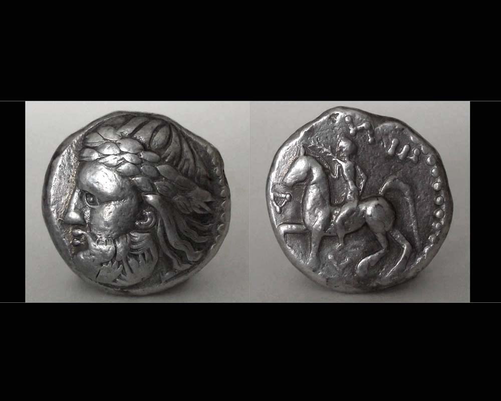 http://www.acsearch.info/record.html?id=622061Das Reversmotiv über dem Pferd hat ebenfalls seinen Ursprung bei der griechischen Legende, ist aber ebenfalls von einem charakteristischem Zickzackmuster weit entfernt.
