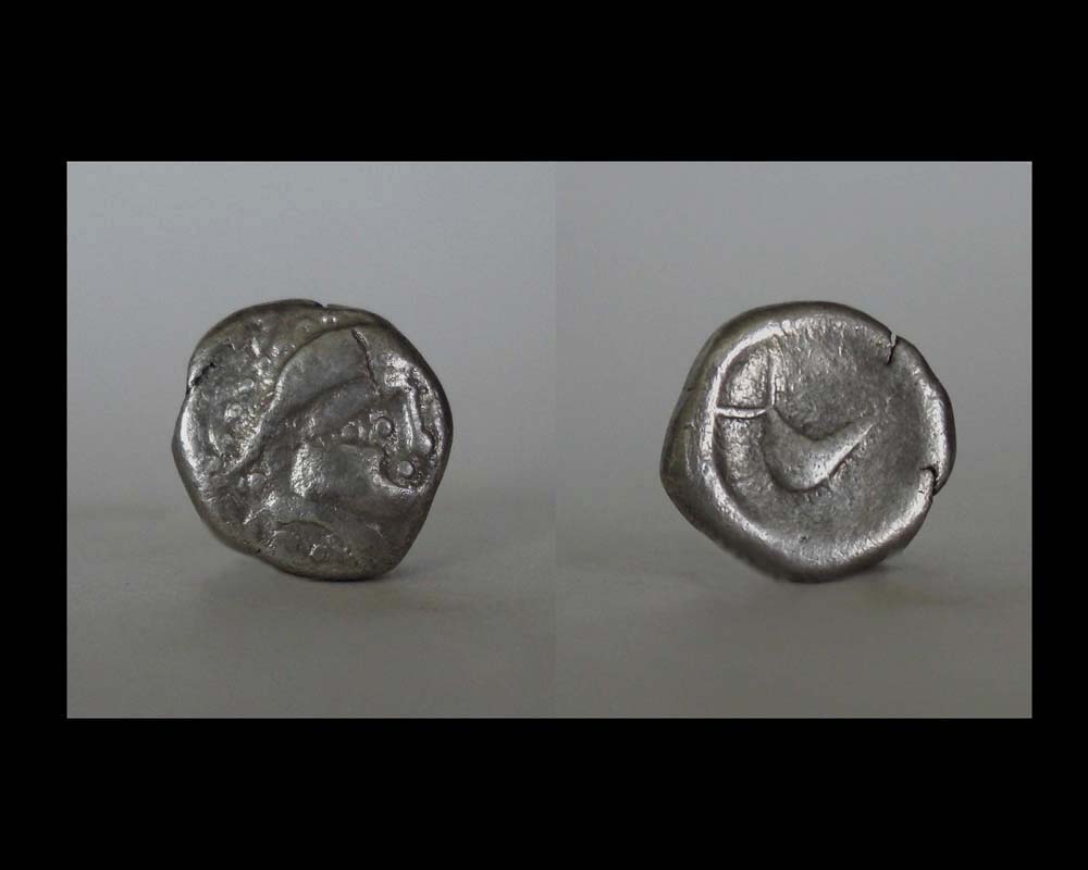 Drachme Typ Zemplin Av: Kopf mit helmartiger Kopfbedeckung nach rechts, bogenförmiger Halsabschnitt, Kugelauge, Kugelmund, alles im Perlrand. Leicht geschüsselter Schrötling aus hochwertigem Silber. Rv: Vogelpferd links (müder Stempel)