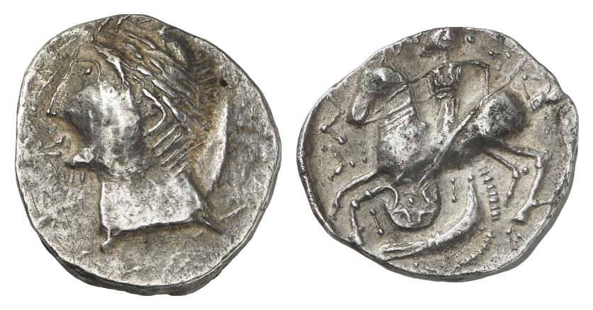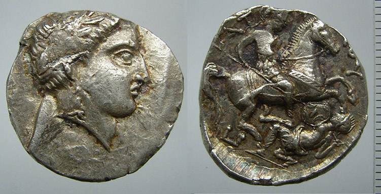 http://www.acsearch.info/record.html?id=701692Allerdings hat der "jugendliche Kopf" bei den meisten Patraos Tetradrachmen das Auge naturgetreu von der Seite dargestellt, während es bei der vorgestellten Münze eher von vorne gesehen (und im Profil ziemlich merkwürdig) wirkt: