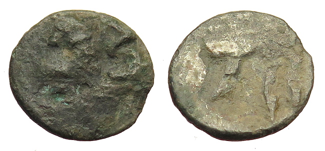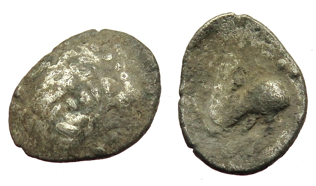 Jetzt auf dem Revers sicher das Hintertei eines Pferdchens und auf dem Avers der Teil eines Perlkreises sowie möglicherweise eine stark stilisierte Haarpracht eines ehemaligen Zeus(?) zu sehen.