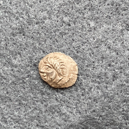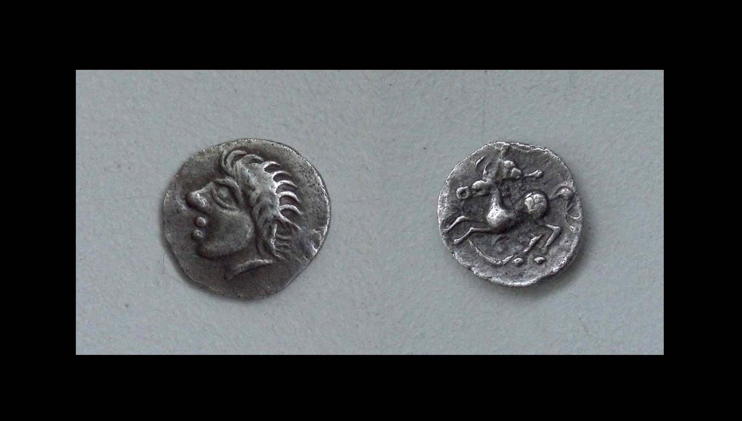 Av: Naturalistisch wiedergegebener Kopf links mit gewelltem Haar, mandelförmigem Auge, Doppelpunktmund und gewölbtem Halsabschnitt (Torques?).