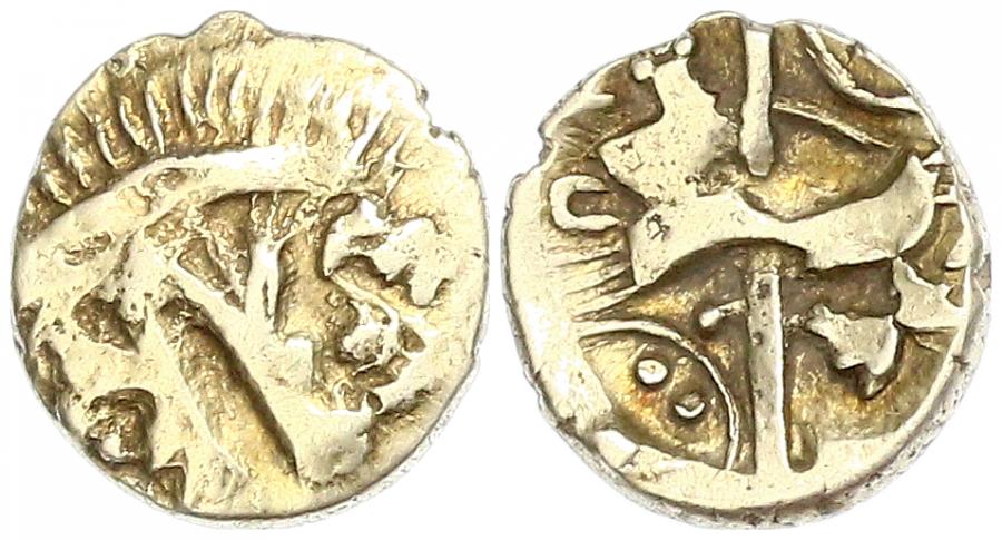 Lieber pontifex72, Du hast einen Quarter Stater, der traditionell den Cantii aus Südengland zugeschrieben wird (van Arsdell 143-1; Allen BRI O; Mack 40). Vergleichsmünzen findest Du unter diesen Links: http://www.celticcoins.ca/vanarsdell.php?tribe=CAN&van=143-1 https://finds.org.uk/database/search/results/vaType/143.01 Im Komentar zur Münze mit der Fundregistrierung HAMP-3218A2 https://finds.org.uk/database/artefacts/record/id/567770 steht "Very early British struck gold coinage or possibly a Gaulish import, the obverse has affinities with coins of the Morini. Many from Hampshire." Insofern könnte die Münze auch von den Durotriges ausgegeben worden sein. Dies erst einmal als kurze Info zwischendurch. Viele Grüße, Docisam |