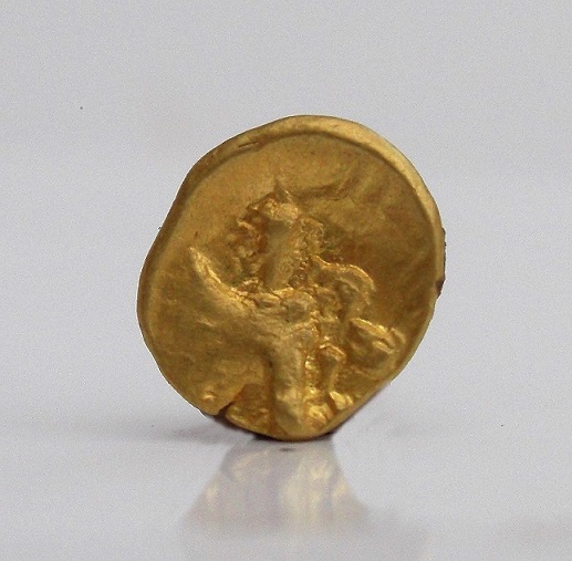 Diese Prägung ist wohl infolge ihres Gewichtes und des Durchmessers den Boiern zuzuordnen und mit Recht als Vierundzwanzigstelstater zu bezeichnen. Vergleicht man die satte Goldfarbe mit Prägungen der frühen und mittleren Athena- Alkis Prägungen, kann man mit hoher Wahrscheinlichkeit auf hochweriges Gold schließen.
