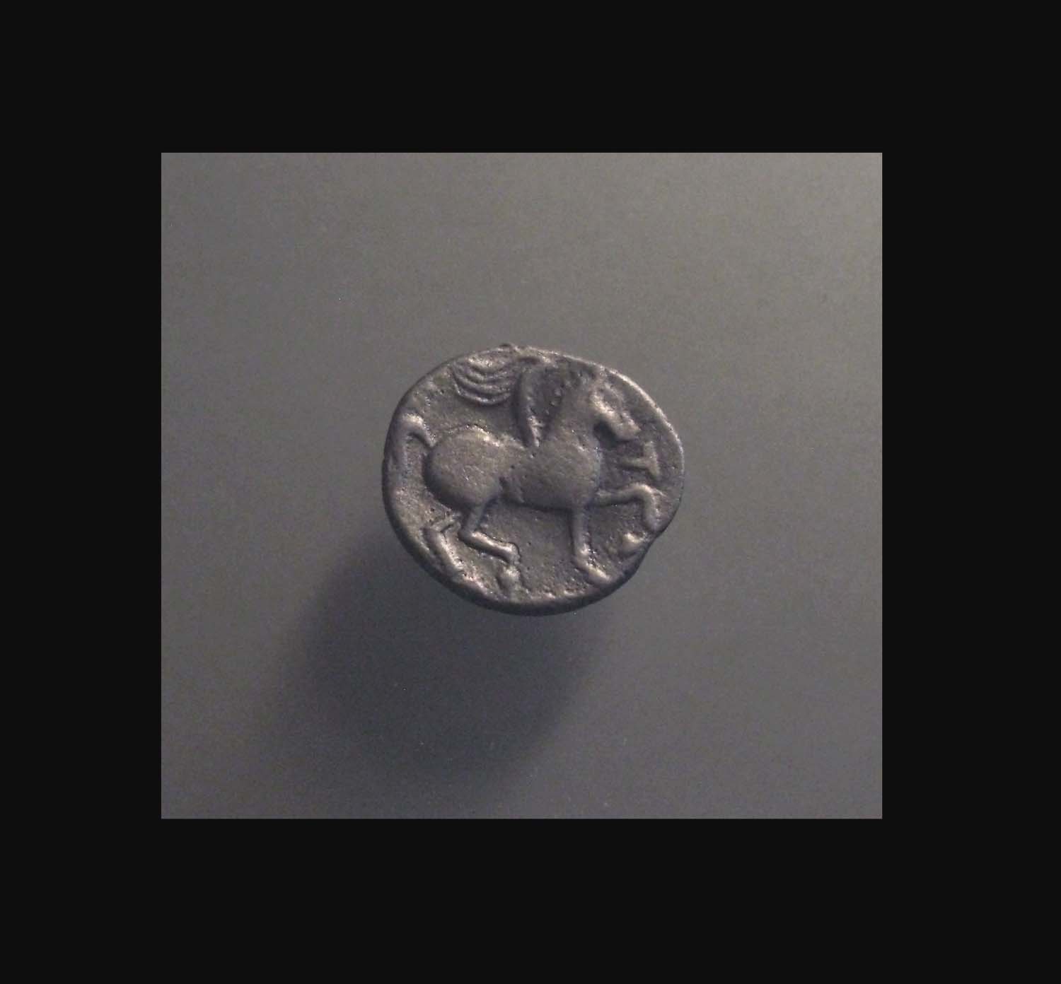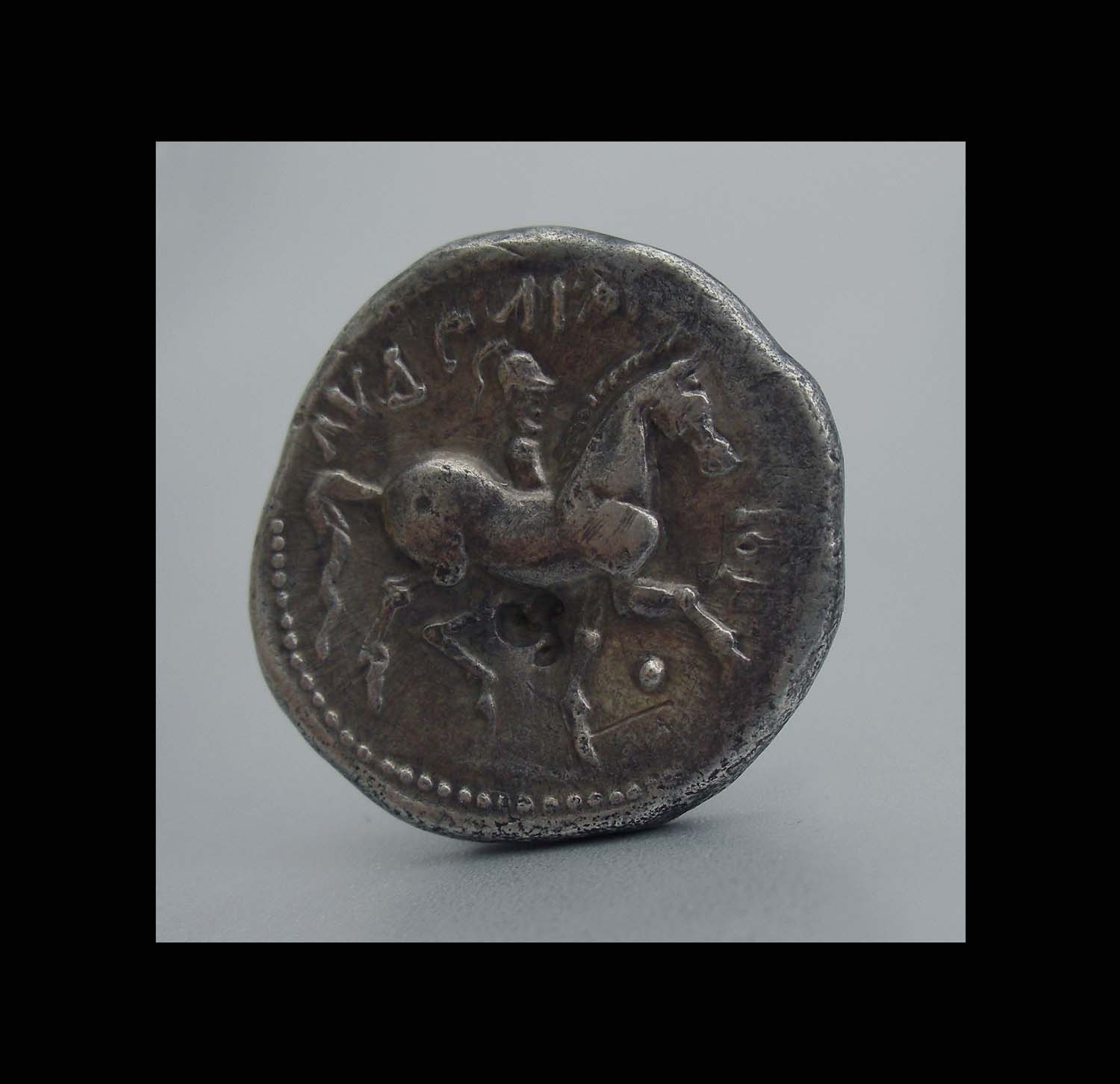 Rv.: Darstellung nach Vorlage der Tetradrachmen des Paionenkönigs Audoleon mit korrekt wiedergegebener Legende. Pferd auf Standlinie hebt im Gegensatz zum Siegesreiter den linken Vorder- und den rechten Hinterlauf. Sehr kleiner Reiterstumpf mit Helmschweif, darunter Einstempelung (Kontermarke) in Form eines Triskeles.