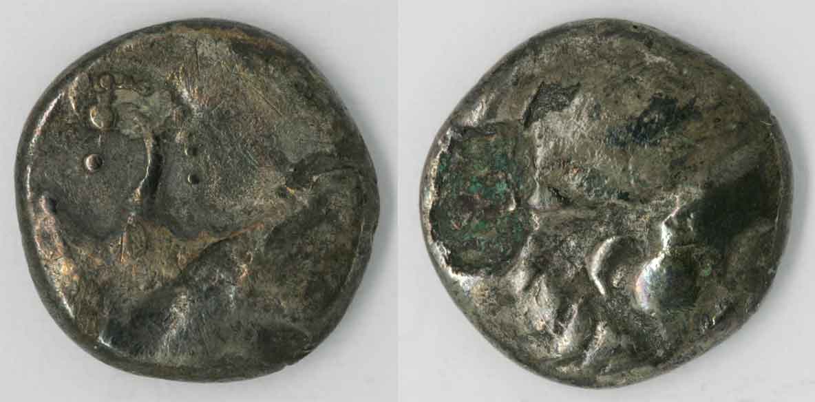 ... bis auf das Beizeichen (es wurden auch Drachmen ohne Beizeichen geprägt) ist die Ähnlichkeit groß, auch das Gewicht würde passen, diese Drachmen bringen so um die 2,5-3g üblicher Weise auf die Waage, das Untergewicht deines Stückes lässt sich durch den unedlen Kern erklären.