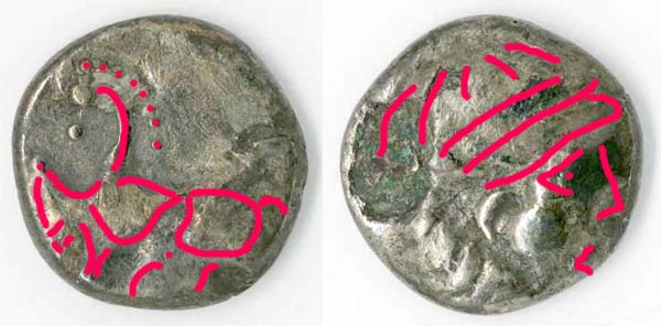 Im Bild anbei habe ich den Linienverlauf der Prägung ungefähr nachzuziehen versucht, Beizeichen konnte ich nicht mehr erkennen, das Münzlein hat doch schon einiges mitmachen müssen ... am Av. erkennt man jedenfalls noch genau den Bartansatz und das Ohr des Zeus und die Kugelwange.