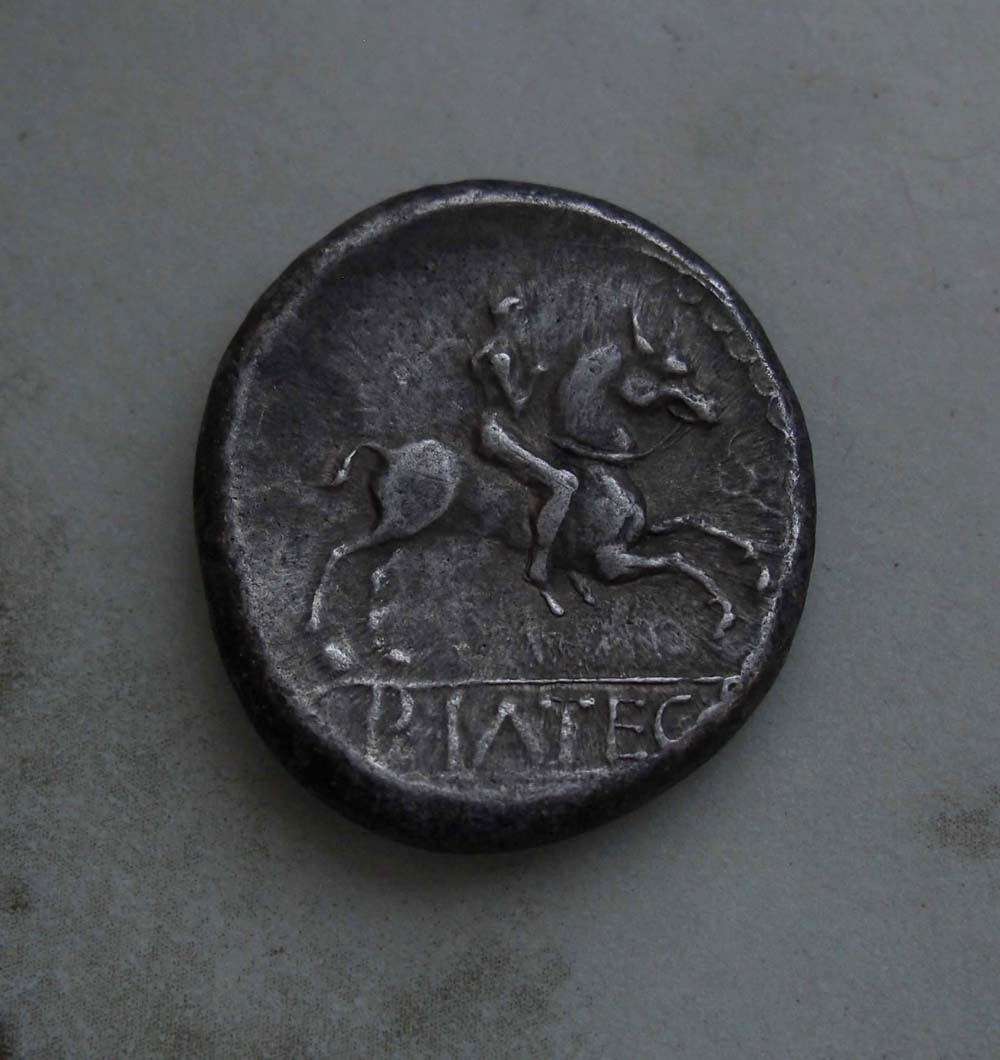Av: Gestaffelte Köpfe des Honos und Virus nach rechts im Arkadenrand. (Vorbild: Denar der Republik des Fufius Calenus und M. Cordus aus dem Jahr 70 v. Chr.) Rv.: Reiter nach rechts auf gezügeltem Pferd mit Greifenkopf. Im Abschnitt: BIATEC Arkadenrand.