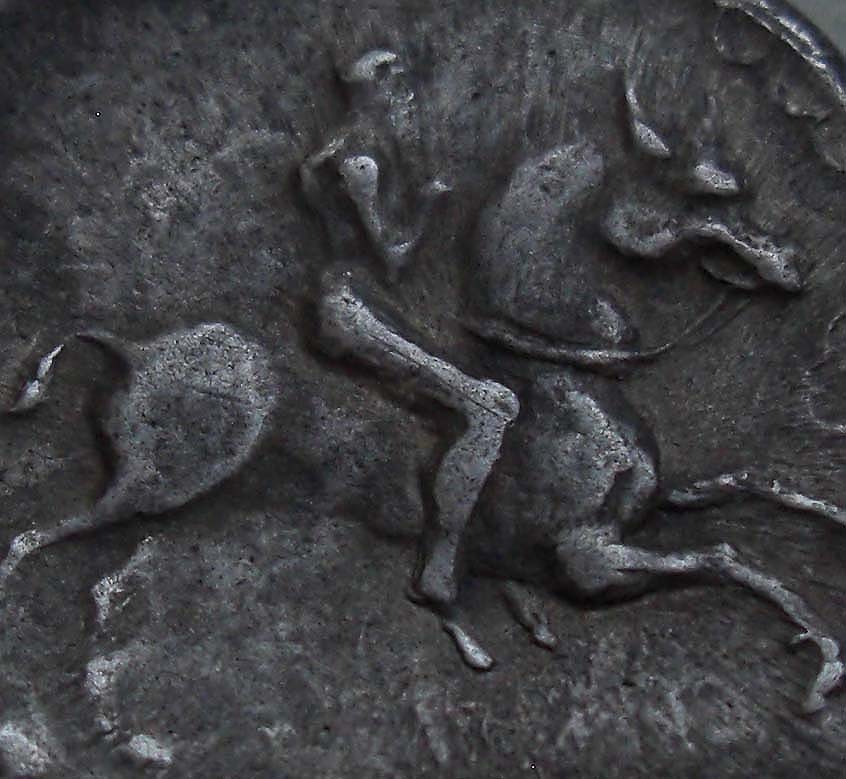 Bei dieser Münze ist der gut ausgeprägte vordere Kopf auf dem Avers und besonders der noch relativ detailreich dargestellte Kopf des Reiters erwähnenswert.
