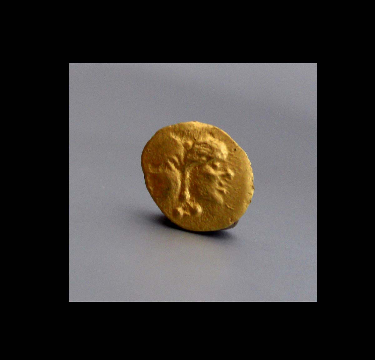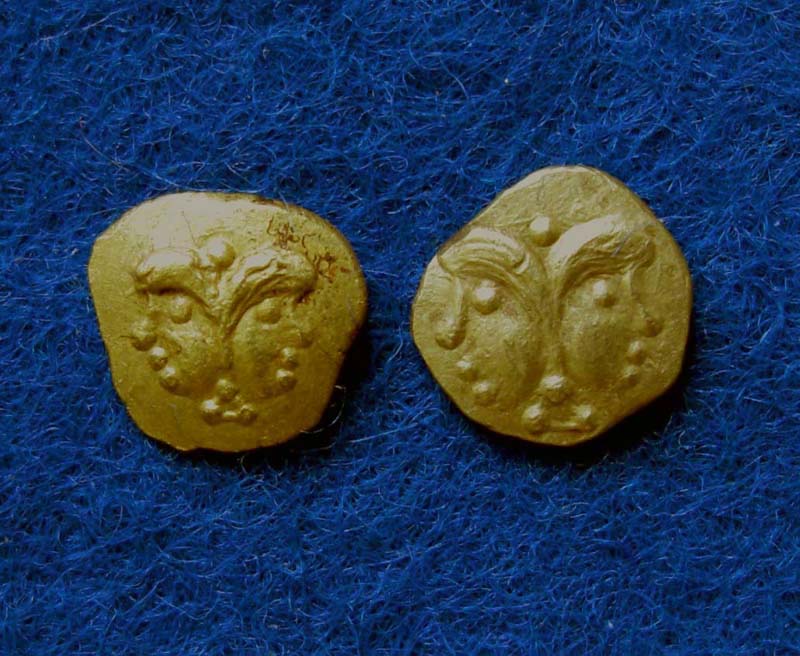 1/24 Stater Typ Janus 1 geschüsselter Schrötling D: 7mm, 6,9mm G: 0,34g, 0,29g Datierung: 220-190v.Chr. Das rechte Exemplar ist nicht nur leichter, es ist auch aus einer stärker legierten Goldlegierung geprägt. Vergleicht man beide Stempelvarianten ist zu vermuten, dass die Stempel der rechten Münze die jüngeren sind.