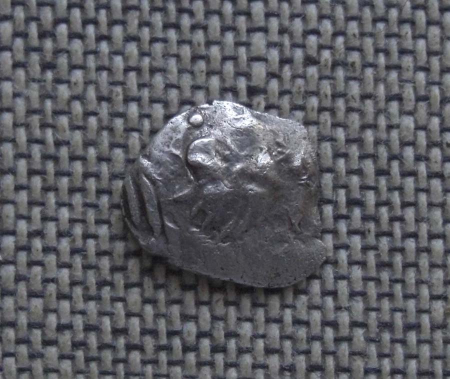 Bei diesem Obol bin ich mir in puncto Orientierung des Aversbildes unsicher. Man erkennt entweder einen Kopf mit an der Stirn abstehendem Haar und spitzer Nase nach rechts, davor eine Kugel, davor 2 senkrechte Linien. Oder ist etwa ein bärtiger Kopf nach links dargestellt? Möglicherweise ist das Bild auch durch eine erfolgte Überprägung entstanden. Rv.: Springendes Pferd ohne Hinterleib nach links.
