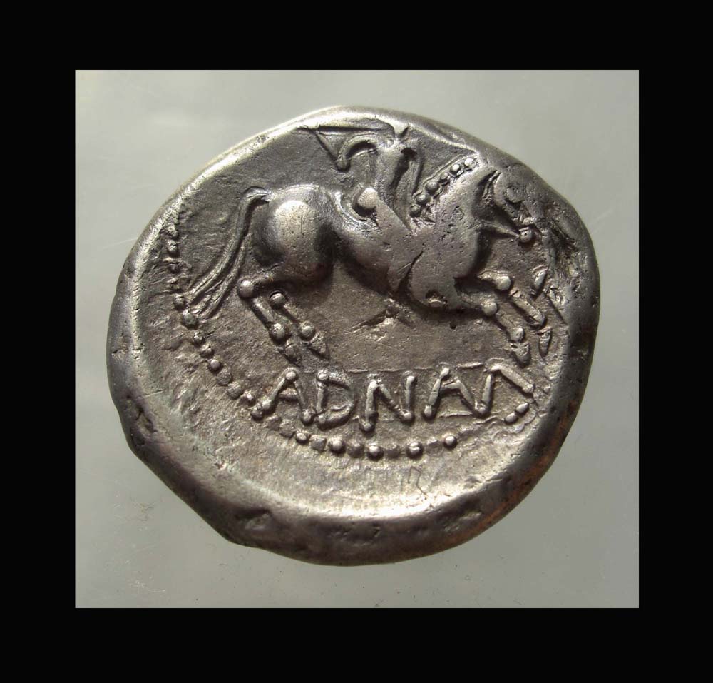 Rv.: Galoppierendes Pferd mit Reiter, der in der Hand eine erhobene Lanze hält. Pferd mit Strichelschweif, Dreieckhufen, alles im Perlkreis. Im Abschnitt ADNAM- (AT), das Aund das M legiert, zwischen zwei angedeuteten Linien.