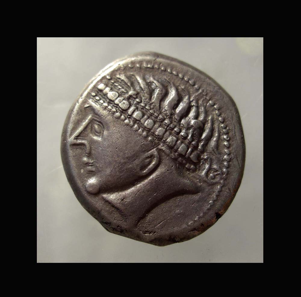 Av.: Kopf links mit dreifachem Perldiadem, gewelltem Haar, Nackenrolle mit Zentralkugel, spitze Nase und Kugelkinn, alles im Perlkreis. Das Bild entstand nach einem tauriskischem Vorbild (K. Strobl, das norische Königreich der Kelten.)
