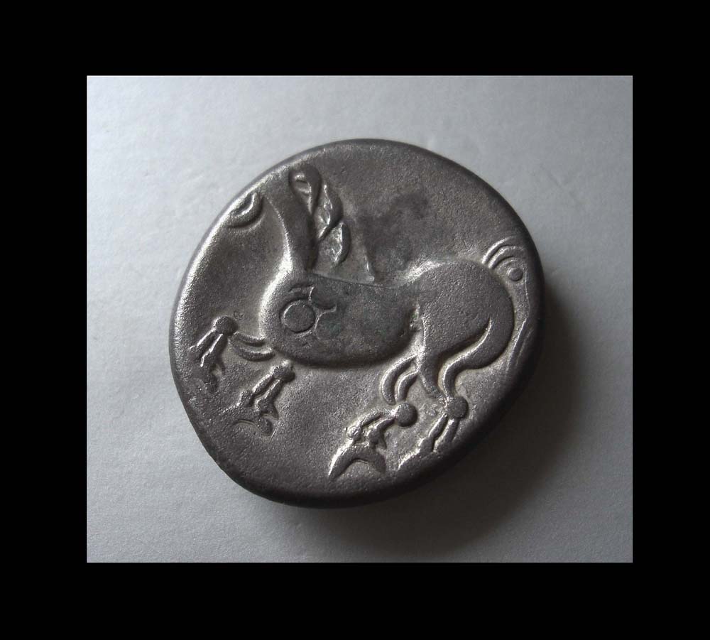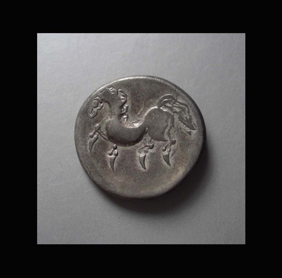 Rv.: Pferd mit Achter- Kopf, wellenförmiger Mähne, halbmondförmigen Hackenhufen und dreireihigem "Kugelgelenk" nach links.