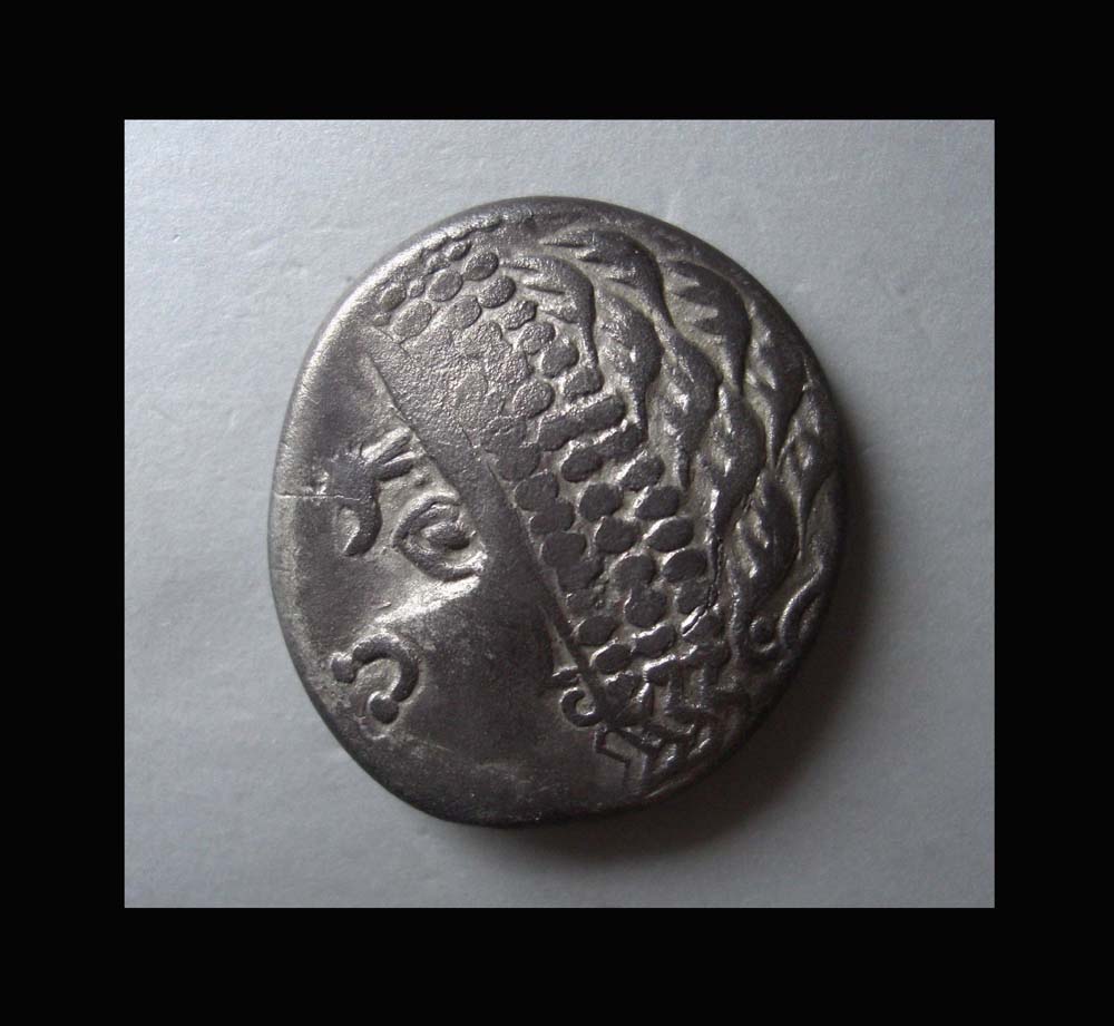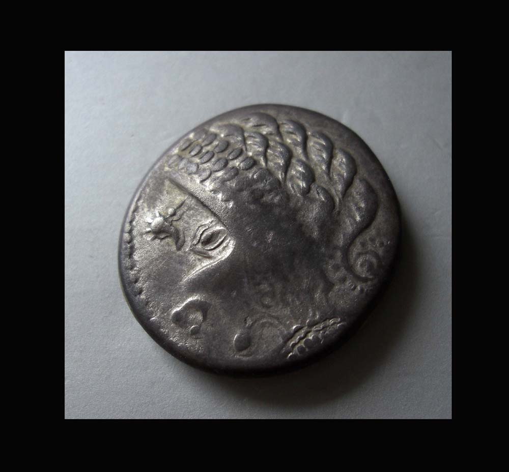 Av.: Kopf mit "Kaktusnase" (Stempelschaden), Torquesmund und dreireihigem Perldiadem nach links, Haare in zwei Lockenreihen.