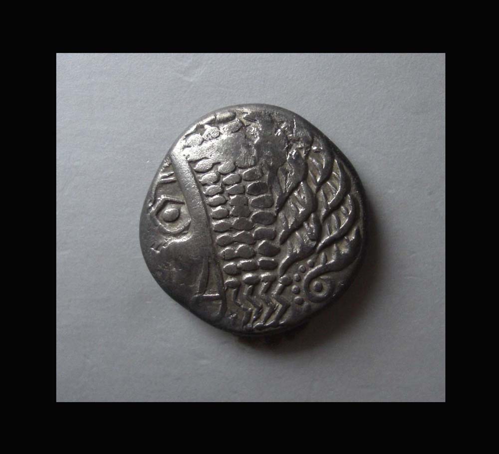 Av.: Apollokopf links mit s- förmigem Ohr, die Nase aus eingezogenen Winkeln, punktförmiges Auge mit ovaler Umrandung,