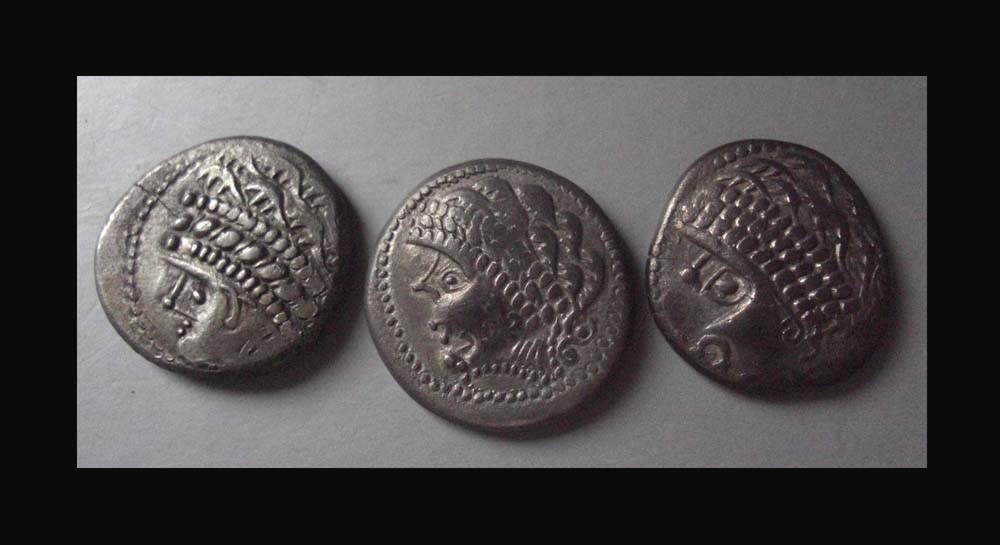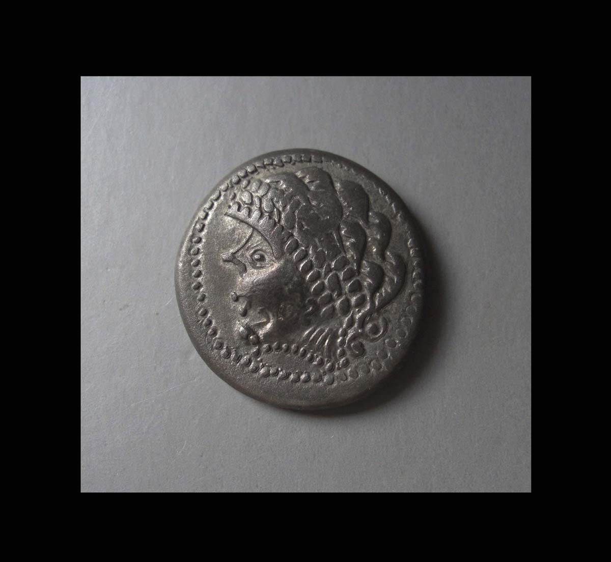 Av.: Kopf mit spitzer Nase, ovalem Auge mit ovaler Pupille, dreireihigem Perldiadem nach links.