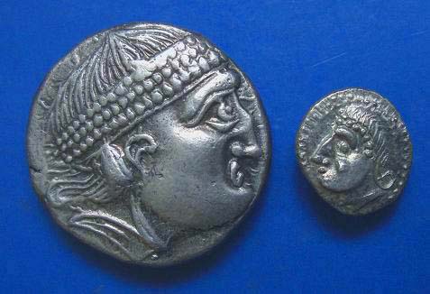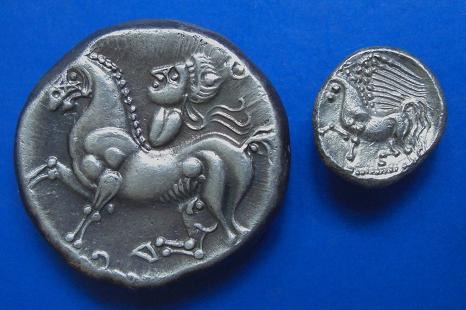 Hier möchte ich Euch mal eine Gegenüberstellung des Kroisbacher Großsilbers mit einem Kleinsilber zeigen. Die Tetradrachme stammt aus der mittleren Prägeserie , charakteristisch dafür ist die ausgeprägte Boxernase und der herabgezogene Mund. Der Revers ist eine nicht so häufige Variante mit einem Hengst, dessen primäres Geschlechtsorgan detailreich dargestellt ist.