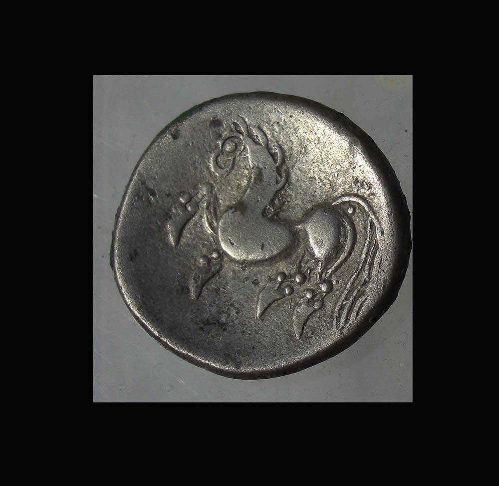 Rv.: Pferd mit senkrechten Messerhufen links. Die Mähne in mehreren Bögen abgesetzt, der Schweifin 3 langen Strähnen herabfallend, unter dem Schweifansatz Kugel. Der Kopf zeigt beginnende Achterform, der Vorderlauf stark angewinkelt.