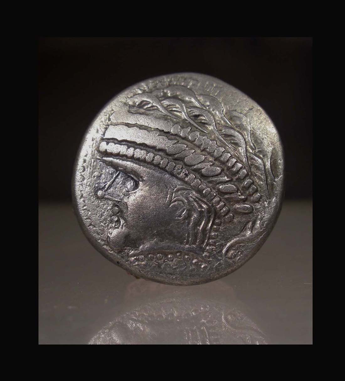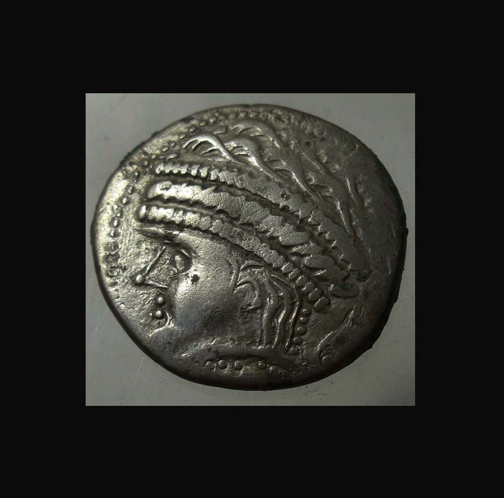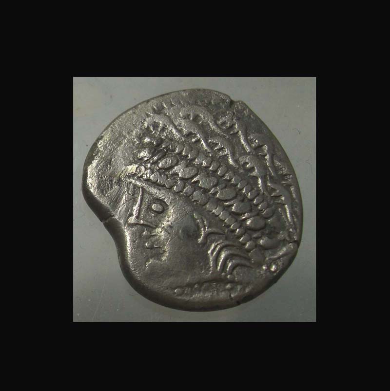 Av.: Apollokpf links mit Diadem zwischen 2 Punktreihen, die Haare in 2 groben Lockenreihen, Winkelnase mit Punkt, Auge und Lippen ebenfalls als Punkte, bogenförmiges Ohr, dahinter 4 senkrechte(!) Haarsträhnen, Kugelkinn, bogenförmiger Halsabschluss, darunter und hinter den Haarsträhnen je eine Kugelreihe, alles im Perlrand.