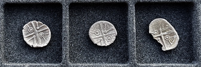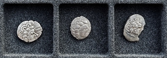 Oft verwechselt werden die Leierquinare mit den "späteren süddeutschen Kreuzmünzen", welche Ähnlichkeiten aufweisen, jedoch anstatt der Leiern auf dem Revers einen Kreis (manchmal mit Mittelpunkt) sowie einen Torques? oder halbmondförmigen Bogen aufweisen. In der Vergangenheit wurde versucht diese Beizeichen als "VOLC" zu lesen, jedoch scheint man sich inzwischen einig zu sein, dass diese auf süddeutschen Kreuzmünzen häufig verwendeten Beizeichen eine andere Bedeutung zu haben scheinen. Zu den späteren süddeutschen Kreuzmünzen werde ich diesem Post im Laufe der Woche noch zwei Exemplare aus meiner Sammlung anhängen, sobald ich dazu gekommen bin diese zu fotografieren.