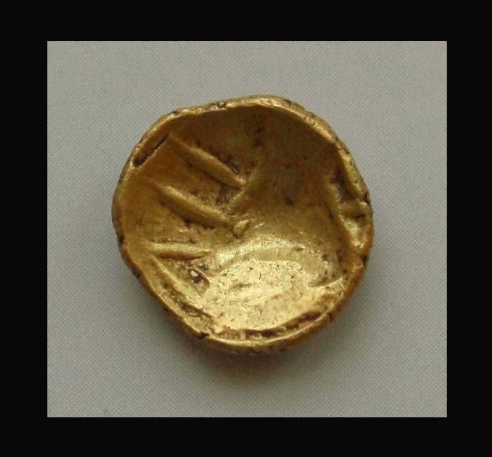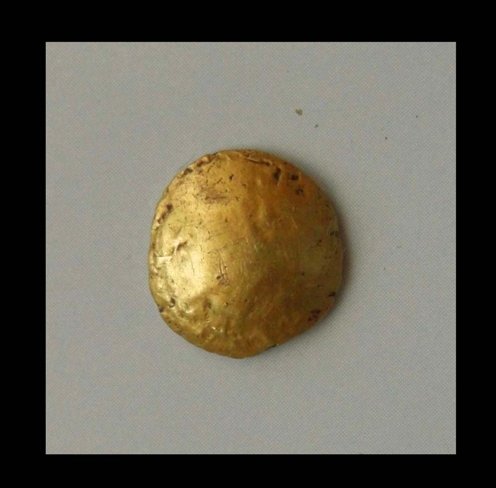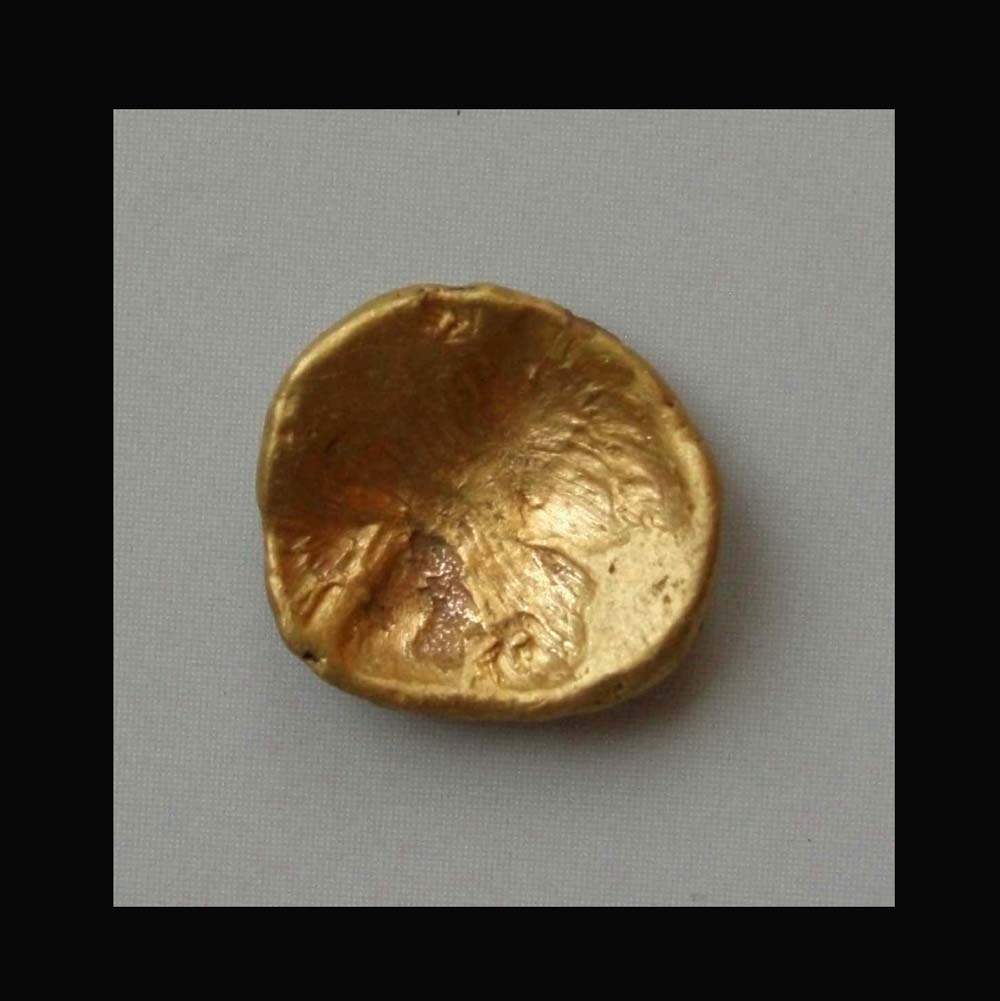 Av.: Buckel mit unregelmäßigen Prägespuren Rv.: geometrisches Motiv mit symmetrischen Linien.