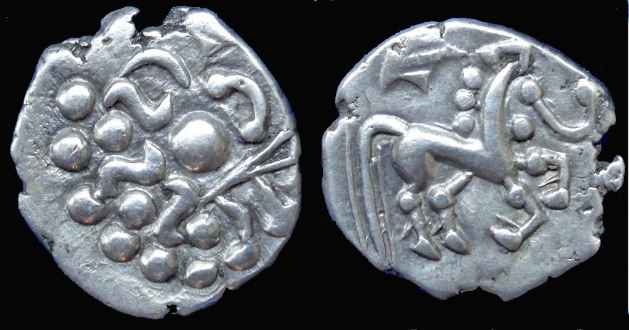 Die Rückseite trägt ein stark stilisiertes Bild eines Pferdes mit einer Art torquesförmigen "Rüssel".