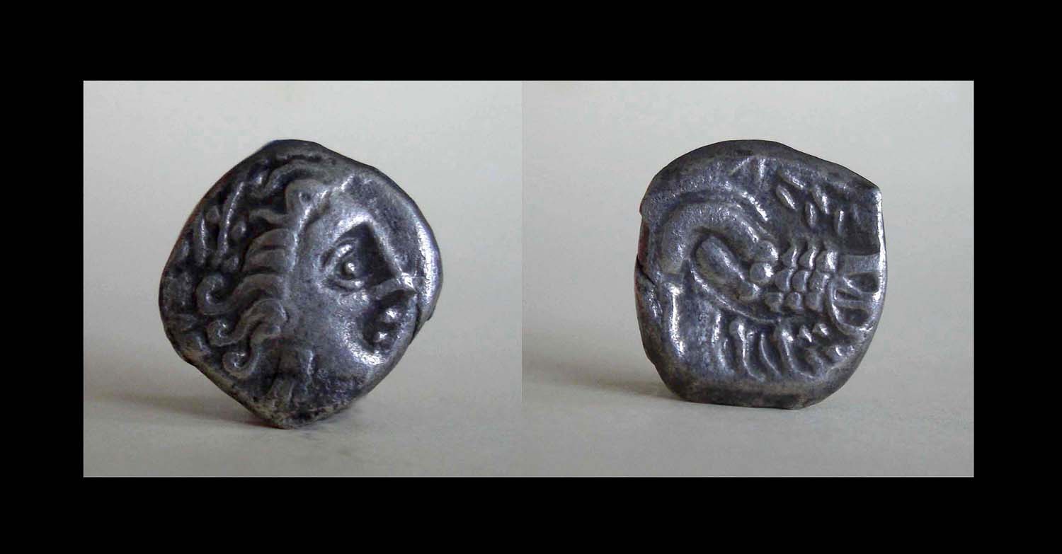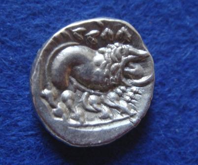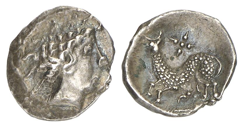 AR-Obol, 3./2. Jahrhundert v. Chr.; 0,78 g. Frauenkopf r.//Gehörnter Vierfüßer l., darüber vier Punkte. BMC vergl. 33 ff.