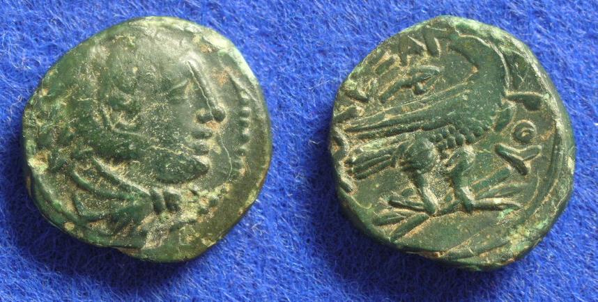 Hey, ich wollte Euch nicht einschüchtern mit meiner Tetradrachme aus Kamarina! Dann mache ich mal weiter mit einer kleinen Bronzemünze, aber in sehr hübschem Stil und aus Alexanders Lebzeit: Price 28, wenn ich's richtig identifiziert habe, makedonische Münzstätte, oft als Amphipolis bezeichnet (genauer legt Price sich nicht fest).