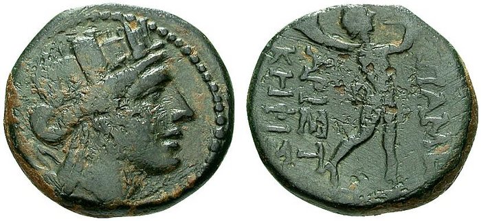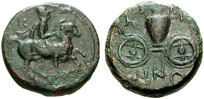 http://de.wikipedia.org/wiki/KausiaDas Gefäß auf der Rückseite wird gewöhnlich als Hydria angesprochen. Eine Hydria ist ein Wassergefäß. Auf dieser Münze ist es aber eher ein Volutenkrater (wiewohl es auch Münzen dieses Typs gibt, die eher eine Hydria abbilden). Ein Krater aber war ein Gefäß, dass eher dem Transport von Wein diente. Antigonos von Karystos berichtet, dass in Zeiten der Trockenheit eine Hydria in einer Prozession auf einem Streitwagen durch die Stadt (oder die Felder) gefahren und Apollo (oder auch Zeus) um Regen angefleht worden sein soll. Ob es wahr ist oder nicht, wer weiß... Jedenfalls sieht das Gefäß eher aus wie ein Weingefäß und ein Streitwagen sollte auch nur eine Achse haben. Also: künstlerische Freiheit der Stempelschneider oder doch ein anderer Mythos?