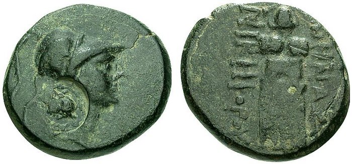 Rv.: ΘEΣΣA – ΛΩN; Athena Itonia im langen Chiton und mit Helm n. r., in der erhobenen Rechten eine Lanze haltend, den Schild in der vorgestreckten Linken. Oben […]Θ – ΩN. Rechts im Feld Monogramm Dreifuß.