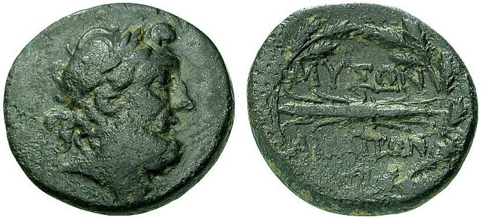 Rv.: MYΣΩN - ABBAITΩN; dazwischen Blitzbündel, darunter Monogramm, alles im Lorbeerkranz.