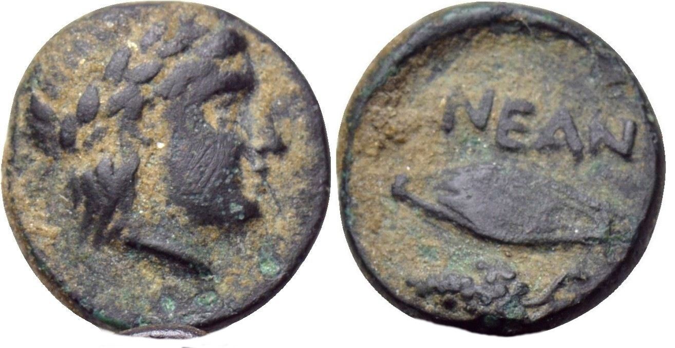 Im Moment halte ich mich mit Münzkäufen ja sehr zurück, aber dieses kleine Stück vom selben Typ wie das von Arminius hat jetzt auch den Weg in meine Sammlung gefunden: AE11. Ca. 350 – 320 v. Chr. 1.26 g. Av.: Kopf des Apollon mit Lorbeerkranz n. re. Rv.: NEAN; Getreidekorn, darunter Weintraube. SNG Copenhagen 448; SNG Kayan 78; BMC p. 73, 4; Sear 4120. Neandria wurde im Übrigen vor gut hundertzwanzig Jahren von Robert Coldeway ausgegraben, desssen lesenswerter Ausgrabungsbericht auch online verfügbar ist: http://www.tpsalomonreinach.mom.fr/Rein ... 5_0005.pdf