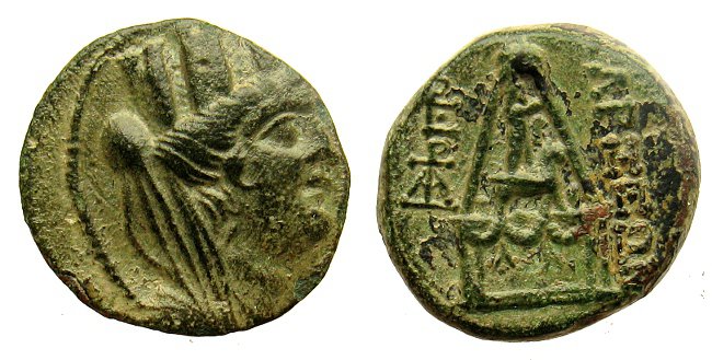 So, die eine oder andere hätte ich noch: Wir befinden uns immer noch weit im Osten, in Syrien. Die Zeit ist immer noch der Hellenismus, bzw. die der Diadochenreiche. Hier nun eine phönizische Münze: Marathos in Phönizien. AE24, 158 – 137 v. Chr.; 10,37 g. Av.: Verschleierte weibliche Büste (Berenike II.?) n. re. Rv.: Marathos, an Säule gelehnt n. li. stehend, in der Rechten Aphlaston haltend; im Felde re. Stadtname in phönizischer Schrift (= m r th), im Felde links Datum. BMC 123, 25ff. SNG Cop. vgl. 163. Ex coll. Roland Müller (M&M Deutschland, Auktion 30, 28.05.2009, Nr.718). Aphlaston: Heckzier antiker Schiffe, die als Siegestrophäe nach Seeschlachten sehr begehrt war. Dateianhang: Zur Stadt: Marathos oder Marathous war eine antike Küstenstadt im nördlichen Phönizien (heute Syrien), die mit der gegenüberliegenden Inselstadt Arados rivalisierte und lange von ihr abhängig war; zwischen 140 und 137 v. Chr. wurde die Stadt durch Arados zerstört, allerdings gibt es Hinweise, dass sie als Kolonie ihrer Eroberer erneut gegründet wurde. Die erhaltenen Ruinen stammen großenteils aus vorgriechischer Zeit. Zur Vorderseitendarstellung ein paar Worte: Es wird vermutet, dass die Dame Berenike II. darstellen soll, die Ehefrau Ptoelemaios III., die beide schon zu Lebzeiten verehrt wurden. Eine schöne Legende rankt sich um das Haar der Berenike: Als ihr Mann kurz danach gegen die Seleukiden in den sog. Laodike-Krieg zog, soll sie ihr Haupthaar der Liebesgöttin Aphrodite geopfert haben, um seine sichere Rückkehr zu erbitten. Sie brachte es im Arsinoë-Tempel ihrer Schwiegermutter unter, der am Kap Zephyrion eine Kultstätte errichtet worden war. Der Haarschopf verschwand auf unbekannte Weise, doch der Hofastronom Konon von Samos erklärte, es sei in den Himmel erhoben worden, wo man es als neue Sterngruppe sehen könne. Der Name Coma Berenices oder Haar der Berenike wurde in Erinnerung daran einem Sternbild am Frühlingshimmel zugewiesen. (ex Wikipedia). |