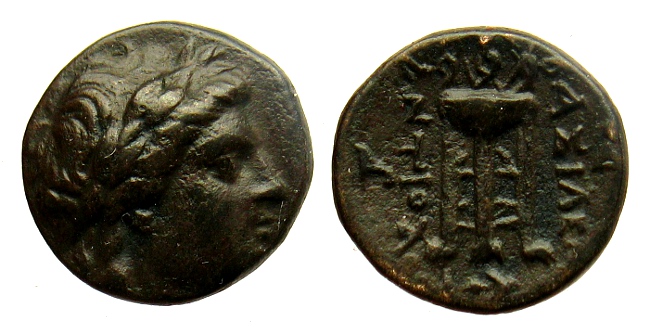 Vielen Dank! Leider gehöre ich nicht zu denen, die das Vergnügen hatte, in der Schule noch Griechisch zu lernen. Dafür jetzt heute noch zwei weitere Bronzen, diesmal sind die Seleukiden dran: AE16. Sardeis. 4,20 g. Av.: Kopf des Apollon mit Lorbeerkranz n. re. Rv.: BAΣIΛEΩΣ ANTIOXOY; Dreifuß, im Linken Feld Monogramm (H?), im rechten Feld Δ. Houghton-Lorber I, 186, 522.9. M&M Deutschland, Auktion 30, 28.05.2009, Nr.700 Dateianhang: AE17. Tralleis (?). 4,00 g. Av.: Kopf des Apollon mit Lorbeerkranz n. re. Rv.: BAΣIΛEΩΣ ANTIOXOY; Dreifuß, im Linken Feld Monogramm, im rechten Feld Φ, unten Anker. Houghton-Lorber I, 191, 537. M&M Deutschland, Auktion 30, 28.05.2009, Nr.702 Dateianhang: Ich mag die Apollondarstellungen auf diesen Münzen, vor allem auf der zweiten. |