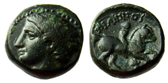 Rev.: ΦIΛIΠΠOY , jugendlicher Reiter n.r., das Pferd paradierend; darunter als Beizeichen ein nach links gespiegeltes E.