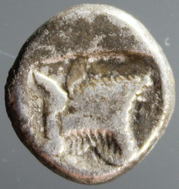 Karien, ungewisse Prägestätte, AR-Triobol, Av.: zwei Stierprotome einander gegenüber, Rv.: Stierprotome n. links in rechtwinkeligem Incuso, ca. 5. Jhdt. v. Chr.; vgl.: Troxell CM 255