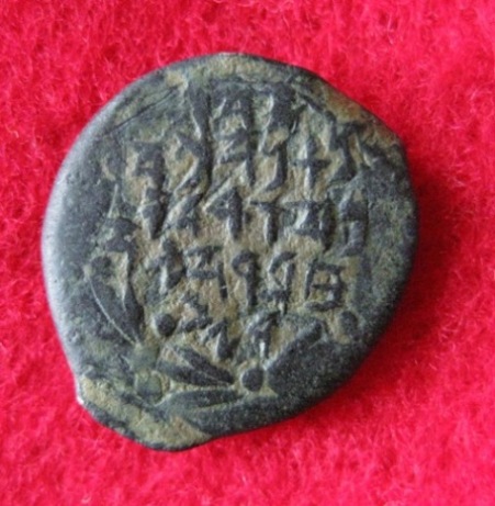1.: Johannes Hyrkanus I.(135-106), AE-Prutah, 2,10 gr, Reif. 11, Mesh.JC 22; MG 30 AV: hebräische Legende "Jehohanan, der Hohe Priester und Mitglied der Juden" RV: Doppelfüllhorn, dazwischen Granatapfel